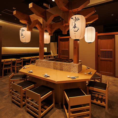 【円卓カウンター】シックなデザインの内装と開放的なムードの中、当店自慢の和酒と絶品料理をお楽しみいただけます。お仲間との語らいに、お一人様やデートでのご利用にも、どうぞお気軽にお立ち寄りください。