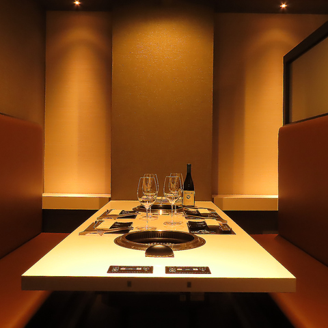 全席個室席になっており落ち着いた雰囲気で焼肉とワインを楽しめる空間となっております。当店は地下一階のフロアになりますが、階段を降りて奥に入る空間は少し特別な隠れ家的なお店となっております。