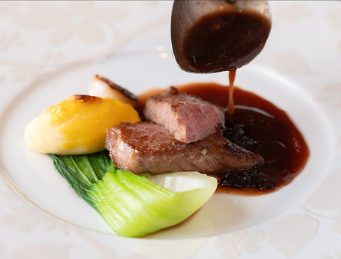 高級食材を贅沢に使った料理を心躍るコース構成で提供。メインの肉料理の『国産牛のフィレ肉』は、記憶に焼きつくおいしさ。特別な日にふさわしい美味の宝庫です。
