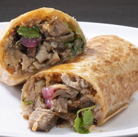 無添加トルティーヤ生地を使用したブリトーは、柔らかくて弾力のある食感が特徴。 【具材】メキシカンライス/ピコ・デ・ガヨ/フリホーレス/ワカモレ/レッドオニオンピクルス/チーズ/カルニタス/サルサヴェルデ/レタス/パクチー
