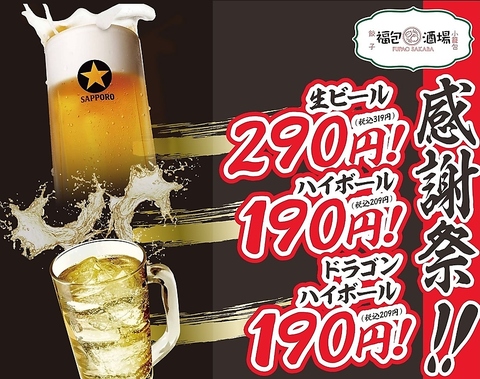 福包酒場5周年を記念し、生ビール、ハイボール、ドラゴンハイボールお安くなってます!この機会にぜひ!