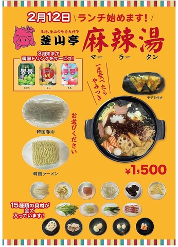 大人気!本格麻辣湯ランチが釜山邸でお楽しみいただけます!具材たっぷり熱々麻辣湯は寒い冬にぴったり。韓国風のおすすめの逸品です。
