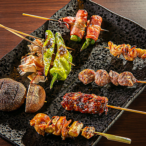【にぎわいコース】なら、自慢の串焼きをはじめとする全8品をリーズナブルにご提供。税込3,000円で前菜からはじまりサラダやご飯ものにデザートまで!120分飲み放題を付けても税込5,200円でご利用いただけます◎