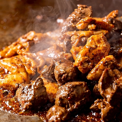 200°cの鉄板で地鶏たちを焼き上げるギャング焼き!赤・黒・白の3種類のタレから選べます!