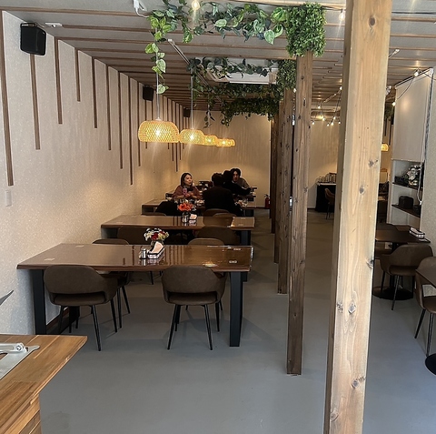 【お洒落な隠れ家レストラン】木の温もりと緑の装飾が織りなす、落ち着きのあるナチュラル空間を演出。開放感を感じながらも、ほどよいプライベート感を保ちます。優しい灯りが照らすテーブル席は食事のひと時をさらに心地よくお過ごし頂けます。当店自慢のヴィーガン料理をこだりのお洒落空間で是非ご堪能あれ♪