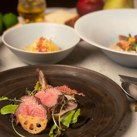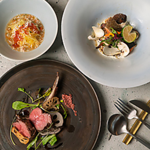 内容はお任せになります。旬の食材をふんだんに使うお料理をご用意いたします。〈例〉アミューズ3品・前菜・パスタ・メインディッシュ・デザート ※写真は一例です。※別途サービス料5%を頂戴いたします。