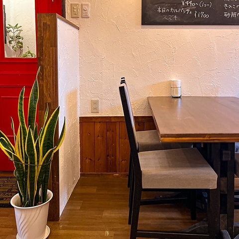 店内に広がるテーブル席は、ほどよい距離感で配置されており、落ち着いた雰囲気の中でゆったりと食事を楽しめます。温かみのある照明とシンプルで上品なインテリアが調和し、心地よい会話が自然と生まれる空間に。デートや女子会、友人との食事、大人の集まりまで、幅広いシーンに対応可能です。