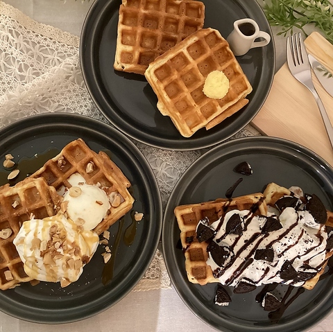 店内で丁寧に焼き上げたワッフルに、アイスクリームとホイップ、たっぷりのオレオをトッピング