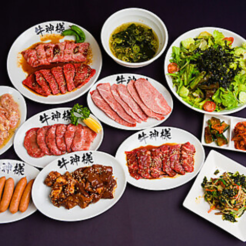 予算に応じて焼肉を楽しんで頂けるよう「子牛コース(全9品)」 「牛コース(全12品)」 「神コース(全14品)」の3つのコースをご用意!コースに合わせてバラエティ豊かなお肉が勢揃い!キムチやチョレギサラダといった前菜からデザートまで充実しており、味・ボリュームともに大満足♪焼肉好きにはたまらない内容です!