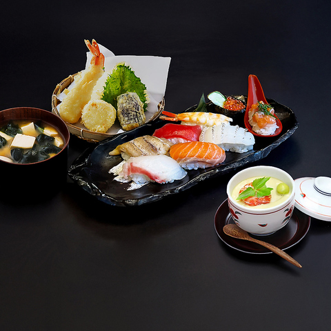 ・季節の先付け・なめらか茶碗蒸し・厳選握り寿司 8貫・海老天ぷら盛り合わせ・お味噌汁お得なセットとなっております。