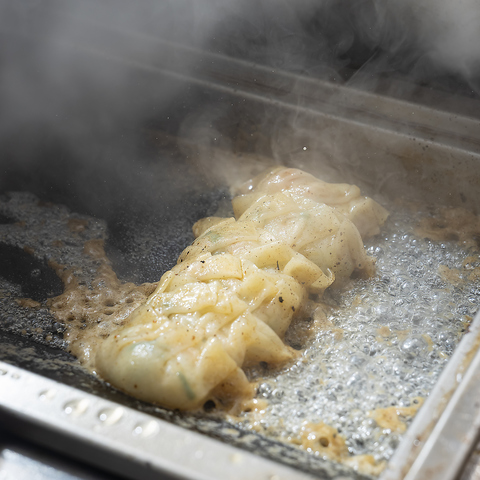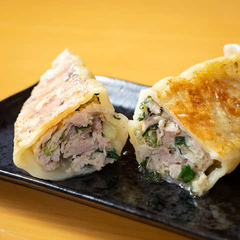 名物の餃子は外側は香ばしくカリッと、中はジューシーな肉肉しい食感にリピーター続出!お酒との相性も◎