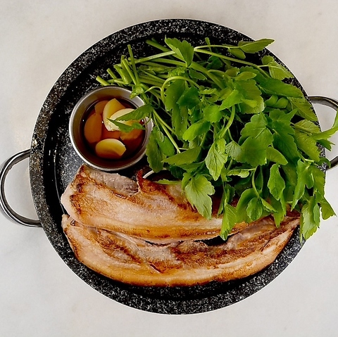 ミナリの爽やかな香りと食感、三元豚の旨味が絶妙にマッチし、野菜で巻いて味わうのが絶品です。