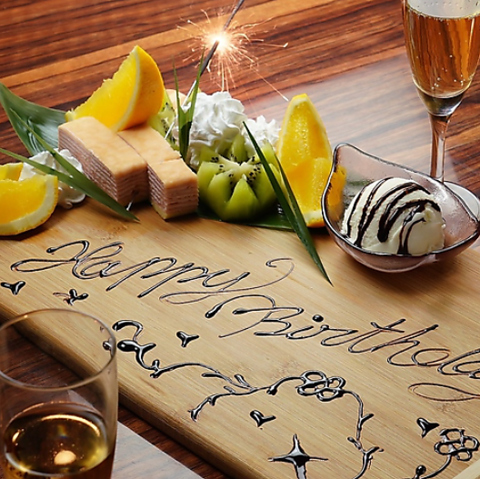 【お祝いに】心を込めたプレートで大切な日を華やかに演出♪ 誕生日や記念日、送別会などのお祝いもお任せください!メッセージを添えた華やかなサプライズプレートをご用意いたします。スタッフ一同、素敵な思い出作りを全力でサポート!演出のご相談など、事前にお気軽にお問い合わせください。