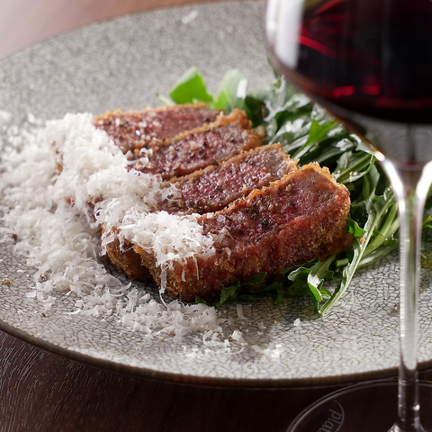 神戸ビーフに匹敵する肉質の碓永牛を使った牛カツは、肉質から考えると、とてもリーズナブルな価格でご提供しております◎肉の旨味が濃厚で、一口食べればそのジューシーさに感動!塩やチーズと一緒に味わうと、さらに美味しさが引き立ちます。ぜひワインと一緒にお楽しみください♪