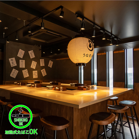 お洒落なカウンター席でゆっくりと、大人の時間をお楽しみください。全12席あり、木目と間接照明が落ち着いた雰囲気を醸し出しています。洗練されたデザイン空間で、こだわりの鰻と鶏料理、そして美酒を心ゆくまでご堪能いただけます。