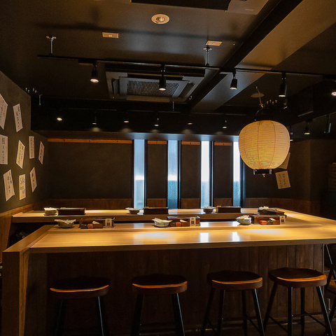 【お一人様やカップルにおすすめ】居心地の良さが自慢のコの字型カウンター席は、お一人様はもちろん、カップルや女子会にも最適です。落ち着いた照明と和モダンな内装が、おしゃれで洗練された雰囲気を演出。充実したお料理とドリンクと共に、ちょっと贅沢な大人のひとときをお楽しみいただけます。