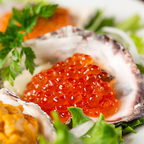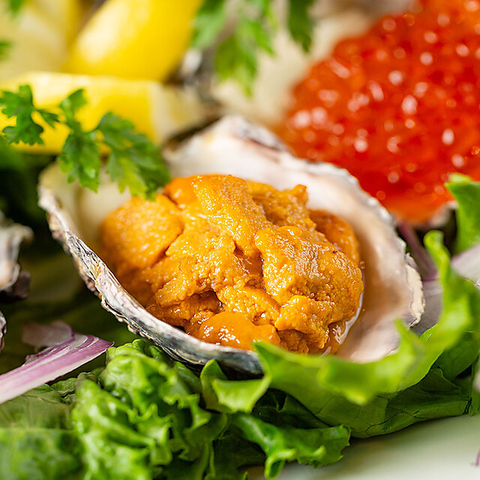 牡蠣にウニやイクラを贅沢にのせたオリジナル創作料理をご用意しております。新鮮な牡蠣の豊かな風味に、ウニのクリーミーさとイクラのプチプチとした食感が絶妙に絡み合い、一口ごとに贅沢な味わいを楽しめます。旬の食材を活かした見た目にも美しい一皿になってますので、海の幸のハーモニーを存分にご賞味ください。当店こだわりの逸品です!