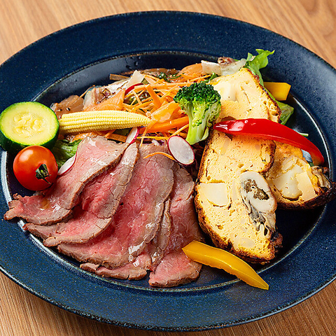 【黒毛和牛クリミステーキ】はオイスターのお店でありながらもしっかりとしたメインの肉料理をリーズナブルで提供しております。ミディアムレアに焼いたお肉と付け合わせのお野菜、しっかりと味の効いたソースでお楽しみいただけるお皿です。