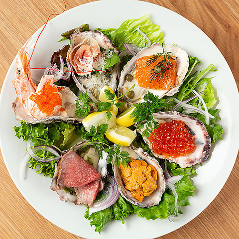 生牡蠣にウニやいくらを乗せたカクテルオイスターなど、オリジナルな創作料理をを多数ご用意しております。
