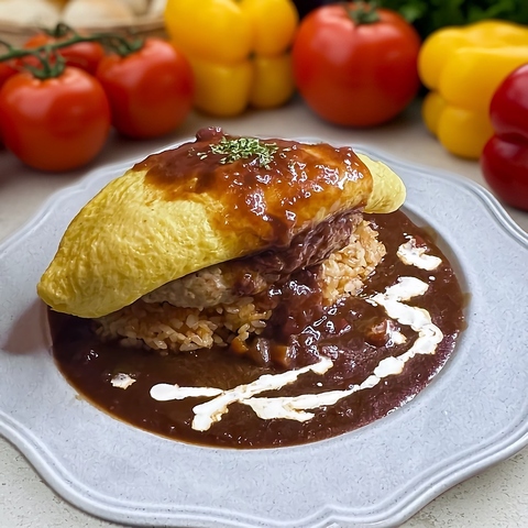 ふんわり焼き上げた卵にナイフを入れると まるで魔法が解けたように”ぱっか~ん”と開き とろとろの卵とジューシーハンバーグのハーモニーは至福のひととき 王宮にもきっと並ぶ、自慢の一品