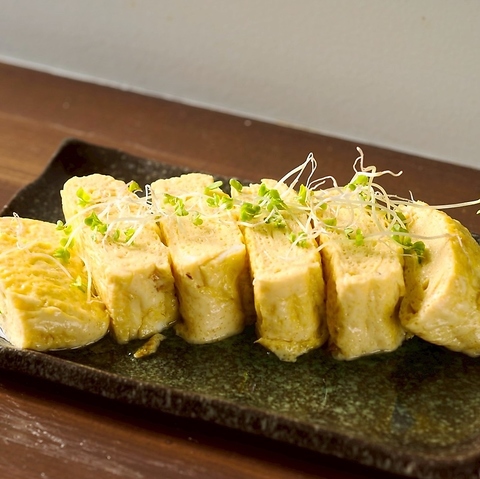 だしを効かせただし巻き玉子は、鉄板で素早く優しく焼き上げます。出来立て熱々のうちにお召し上がりください。