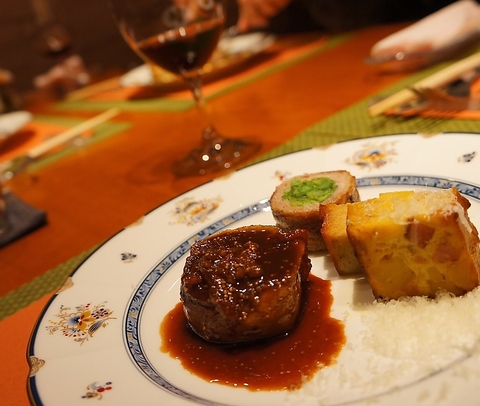 お昼のランチコースは選べるドリンク1杯付きでお得にお楽しみいただけます。ヒレステーキが自慢のステーキコースとも称され。素材はその日ごとにオーナー自ら厳選したもののみを使用。ワインも厳選して仕入れておりますので、お好みのドリンク片手に自慢の創作料理をお楽しみください。(フルコースの写真です)