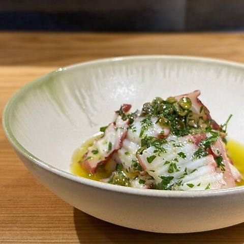 タコをスライスした切り身にレモンベースのオイルソースですっきりとした一品。