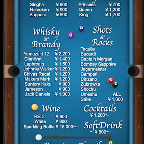 当店のドリンクは、美味しさを追求するために厳選されたものばかりです。多彩な選択肢から、自分だけのお気に入りを見つけられる楽しみがあります。Whisky、Brandy、Shots、Rocks等・・・多数のドリンクをご用意しています。Yamazaki12は独特な香りと味わいが特徴で、贅沢な一杯です。飲み放題内容は店舗までお問い合わせください。