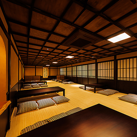 畳風の床が広がる座敷席は、温かみのある和の雰囲気が漂うくつろぎの空間。座布団に腰をおろし、足を伸ばしてお食事をお楽しみいただけます。最大50名様まで利用ができ、貸し切りも可能となっております。
