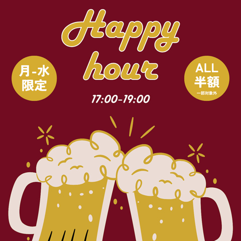 月~水の17-19時はハッピーアワー開催中♪ドリンクがなんと半額に!お仕事帰りに一杯いかが?