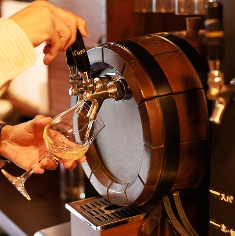 当店自慢の樽生ワインは、赤ワイン2種類、白ワイン2種類、スパークリングワイン1種類の計5種類をご用意しております。樽からグラスに注ぐまでに空気に触れないように管理しているため、いつもフレッシュな品質を保っており、まるでフランスやイタリアの現地で楽しむかのような本格的なワインの味わいをお楽しみいただけます!