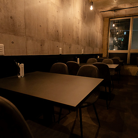 【スタイリッシュな空間でお食事を】コンクリート壁にブラックインテリアで統一されたお洒落でモード雰囲気の店内には、テーブル席が約20席ございます。貸切がご利用可能なので詳細は店舗にお気軽にお問い合わせください◎ナチュラルワインとカジュアルイタリアンをご用意してお待ちしております!