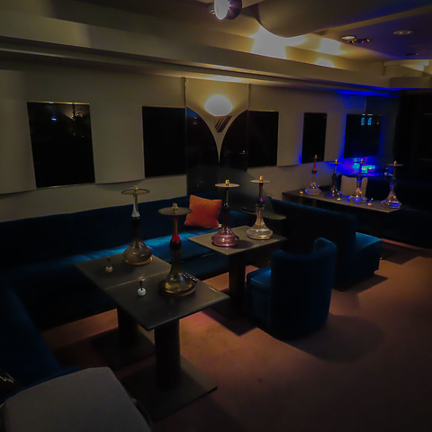 テーブルにシーシャがセットされており、クラブのような洗練された空間が広がっています。青いソファーが落ち着いた雰囲気を演出し、リラックスしたひとときを提供します。友人と共にシーシャを楽しむのにぴったりな場所で特別な時間を過ごせます♪