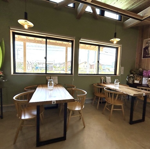 【広々としたテーブル席】大きな窓と吹き抜けは店内を明るく照らし出し、席の間も広くとっておりますので、広々とした雰囲気の中でゆっくりとお食事をお楽しみいただけます。木材を貴重とした店内や、温かみのある暖色系の照明はどこか懐かしい雰囲気です♪開放感のあるテーブル席は、ご家族でのお食事や小規模でのお集まりなどにピッタリです!