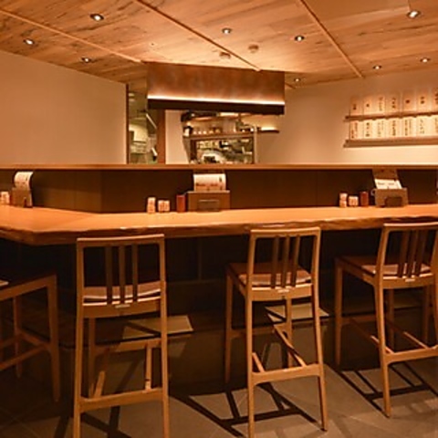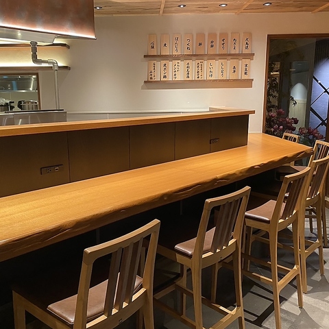 一枚板の美しい木目が映えるカウンター席は、お一人様でも気兼ねなく食事を楽しめる特等席です。目の前で繰り広げられる料理人の鮮やかな手さばきや、炭焼きの香ばしさを感じられます。温かみのある照明と木のぬくもりが心地よく、ゆったりと落ち着いた空間を演出します。