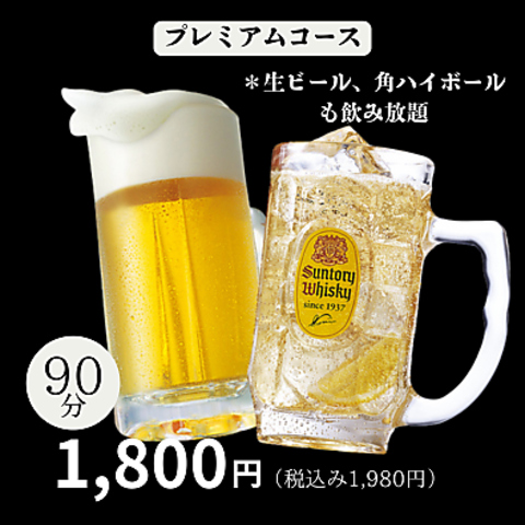 飲み放題は3種類。生ビール付プレミアム飲み放題1,800円(税込1,980円)、チューハイ・カクテル中心のスタンダード飲み放題1,500円(税込1,650円)、ソフトドリンク飲み放題800円(税込880円)120分の飲み放題メニューです(L.O30分前)、グラス交換制でお願いします!