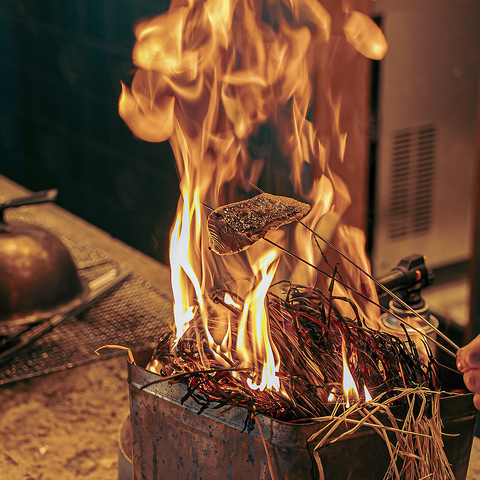 藁を焼くことで生まれる高温の炎で、素材の旨みをぎゅっと閉じ込めます。絶妙な手捌きで程良くいぶされた食材の美味さは格別です!藁焼き独特の芳ばしい香りもたまりません。目の前で迫力満点に焼き上げる様子は必見♪臨場感たっぷりの演出がさらに食欲をそそること間違いなしです◎