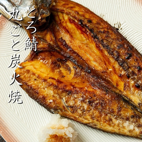 当店自慢の「とろ鯖」は、脂がのった新鮮な鯖を一匹まるごと使い、豪快に炭火焼きで仕上げた逸品です。その香ばしい香りと、外はパリっと、中はふっくらとした絶妙な食感が楽しめます。特に脂ののった部分は、口の中でとろけるような美味しさです。売り切れ御免の人気メニューです!