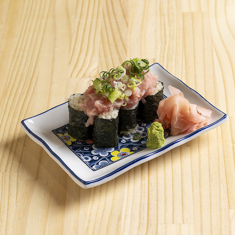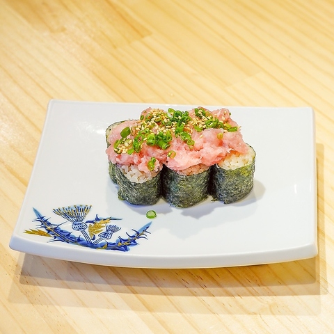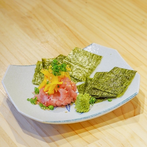 酒呑みの為のアテ巻き。上の具材だけで飲んでも良し、ネギトロを乗せて巻物として食べても良し。ちびちび飲める一品です。ガリ鯖巻真鯛巻雲丹いくら巻もご用意しております。