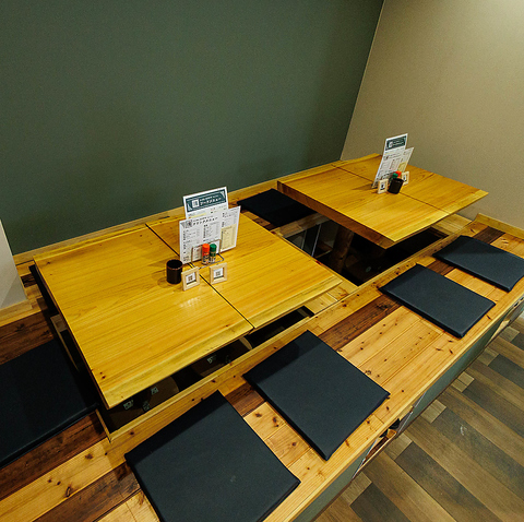堀りごたつ席には、一本の木から作ったこだわりのテーブルを使用しています。木の温かみが感じられ、落ち着いた時間を過ごすことができます♪また、木の香りがよりリラックスさせてくれます。堀りごたつ席は2名掛け、3名掛け、4名掛けの3種類がございます!シーンに合わせてぜひご利用ください♪