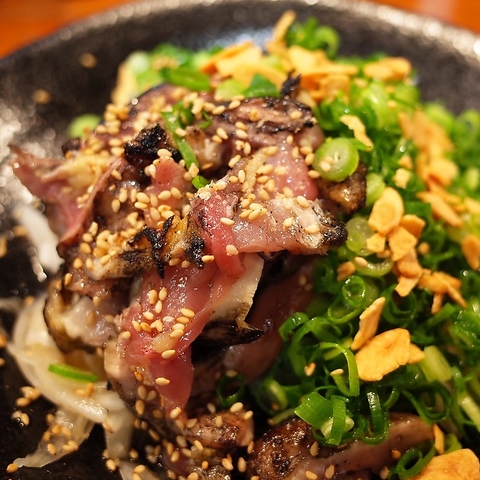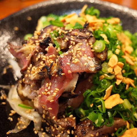 香ばしさとジューシーさが絶妙なバランスの、鶏のタタキもおすすめ! 新鮮な鶏を使用し、炭火で炙っているため、鶏の旨味がたっぷりと味わえます!一度食べるとやみつきになること間違いなしです! お酒のアテにぴったりの逸品です。
