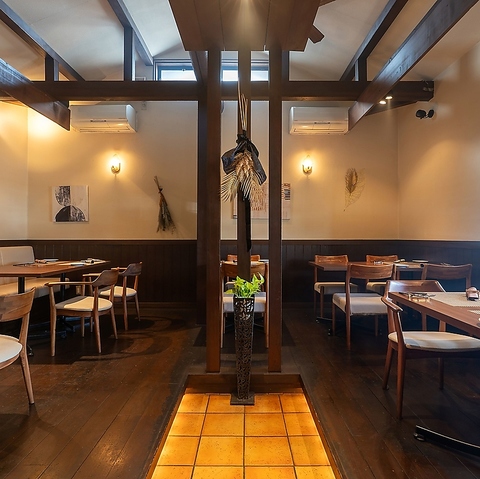 レストランの建物は築40年の古民家をリノベーションしております。シェフの祖母の家を改装した趣ある佇まいで、柱や梁はそのまま残し、日本家屋ならではの木のぬくもりを感じながらお食事を楽しめます。洗練された雰囲気ながら心安らぐ空間です。ゆったりとお食事をお楽しみ下さい。