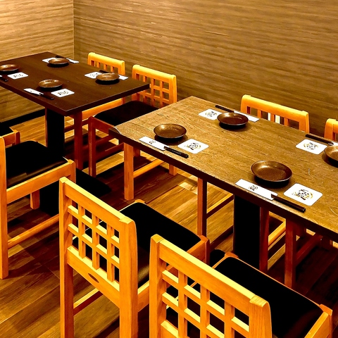 【会社宴会・プライベートの飲み会に◎半個室テーブル席2名様~】和の趣き溢れる店内は大人の為の落ち着いた雰囲気となっております。2名様~ご利用可能なテーブル席は少人数から中規模・大規模のご宴会でご利用頂けます。新鮮な鮮魚やこだわりの地鶏や黒毛和牛・農家野菜を使った野菜巻きなどを是非お楽しみください。