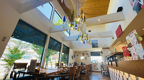 白と木目を基調とした店内は吹き抜けも高く、明るくて開放的な空間を演出。お子様連れのお客様も大歓迎ですので、ご家族やファミリー、ご友人でのお食事から女子会やママ友、会社様や団体など様々シーンでご利用いただけます。