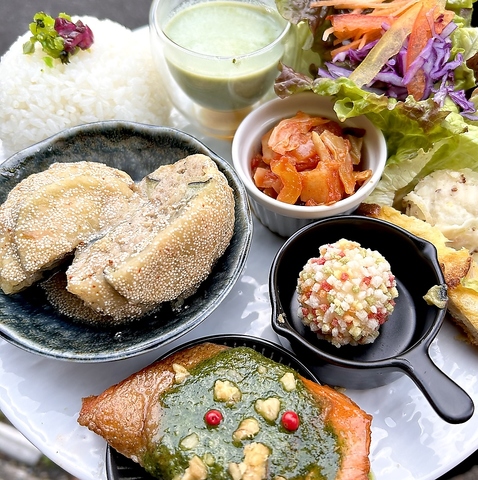 とある週のハーフ&ハーフプレート。お肉と魚介のどちらも少しずつ食べたいときにおすすめのハーフ&ハーフプレート。当店人気No.1メニューです。