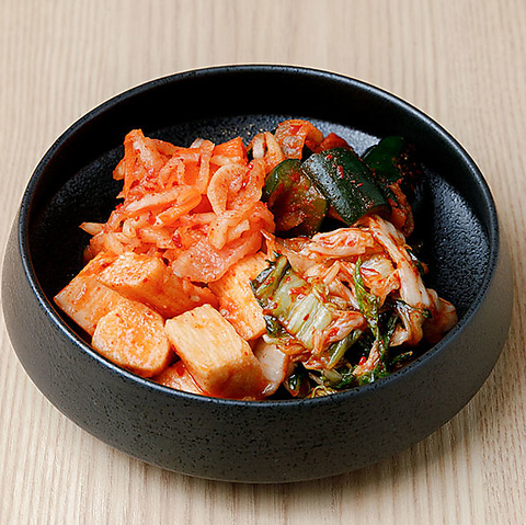 真焔のキムチは、店内で丁寧に手作り。定番の白菜キムチはもちろん、山芋、ヤングコーン、ホタルイカなど、旬の素材を使った創作キムチは、まさに“もう一皿食べたくなる”逸品揃いです。焼肉を引き立てるだけでなく、季節の香りと食感を楽しめる、真焔自慢の前菜です。