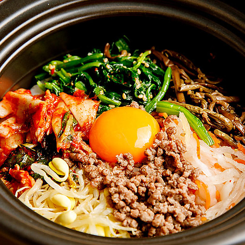 牛肉100%の粗挽きミンチと自家製ナムルを使った真焔の石焼ビビンバ。パチパチと立ち上る香ばしいおこげとともに、五感で楽しむ“焼肉屋の本気の締めごはん”です。
