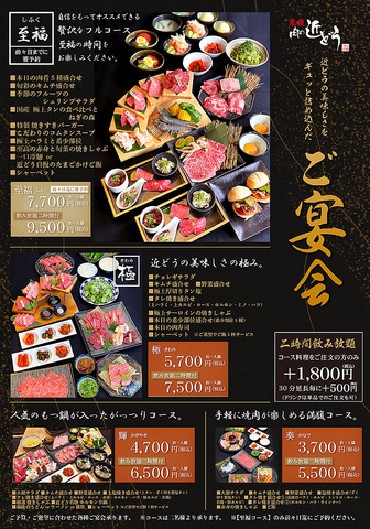 4700円コースでは「近どう名物ホルモン辛鍋」、5700円コースでは豪華に希少部位盛り合わせや肉寿司、極上サーロイン焼きしゃぶなど贅沢の極みを味わえます!