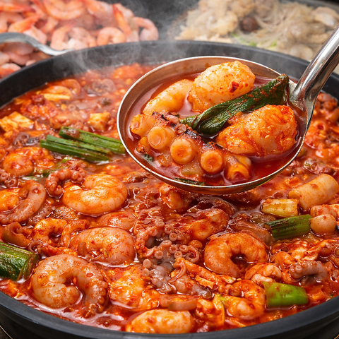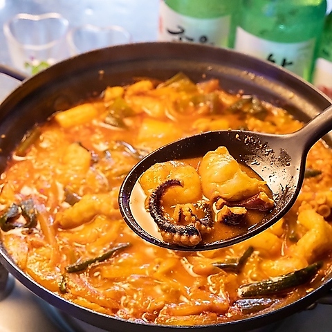 韓国釜山で定番のナクチ(タコ)コプチャン(モツ)セウ(海老)牛モツ海鮮鍋!甘辛い鍋でソジュがすすみます!辛さは3パターン選べるので辛さに選べるので自信がある人は激辛に挑戦してみてね!