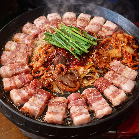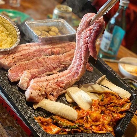 お肉を1~2枚追加してご注文!がおススメ!/スタッフが目の前でカットします!/圧倒的人気ナンバーワンメニュー!!厚切り(20ミリ)の豚バラ肉をスタッフが焼いてハサミでカット!あとは弱火でこんがり焼いてください。薬味と一緒に野菜で巻き、サムジャン(辛みそ)濃厚えびゴマ油タレをつけてお召し上がりください。マシッソヨー!(おいしい!)